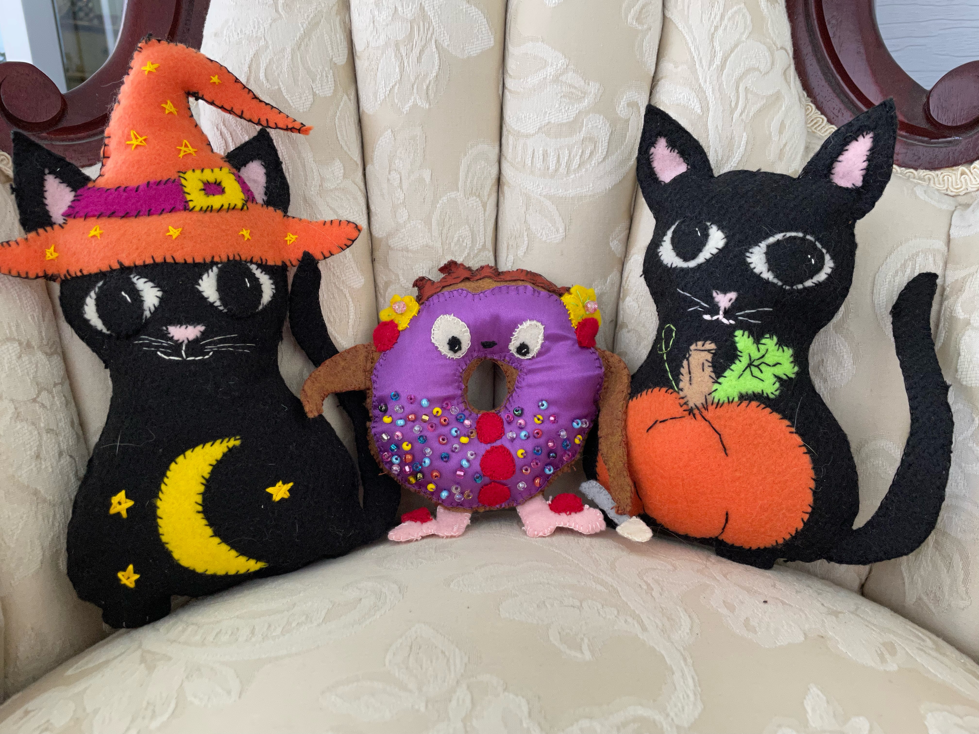 I also took Coco’s photo with the two kitties I made last year around Halloween. Both kitties were made from homemade patterns that I have been experimenting with.