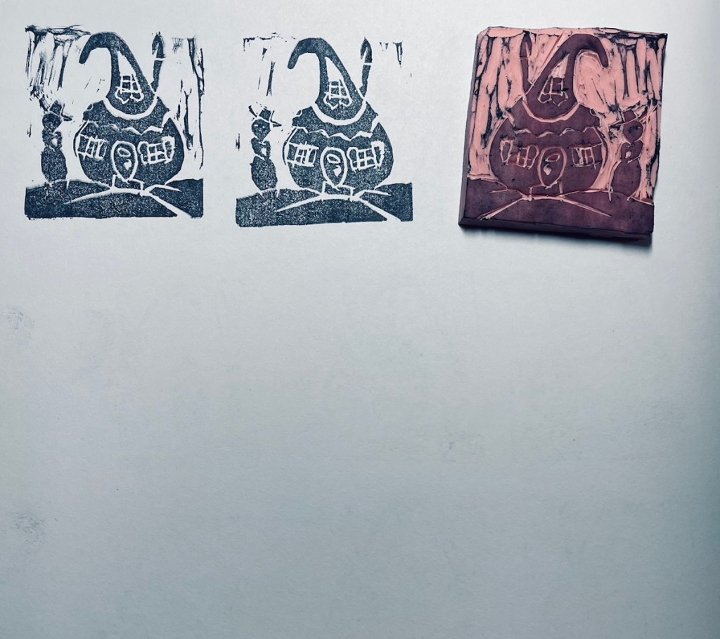 The only thing about doing stamps where I am trying to create a character or scene is, they take longer to make, because I have to keep making test prints to see how it looks. I did two pages of test prints before I made it to this stage.