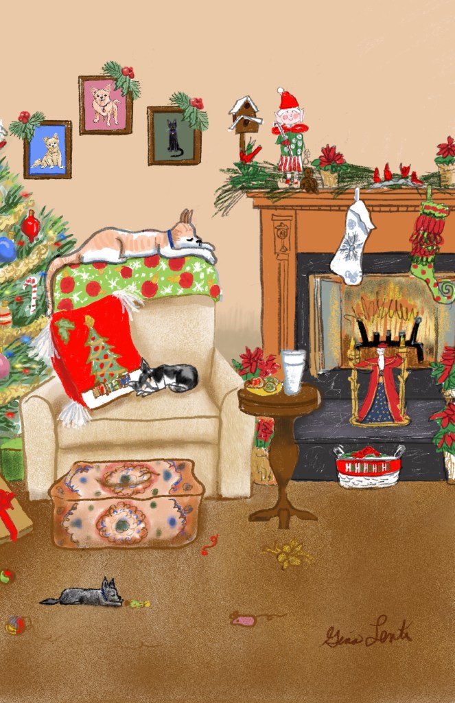 Day 10 – Sugar Cookies by the fire. My Christmas card was used as a springboard for this one. I already had the cookies and milk. I moved the whole scene over to add the fireplace, which was our fireplace when we used to live on Long Island.
