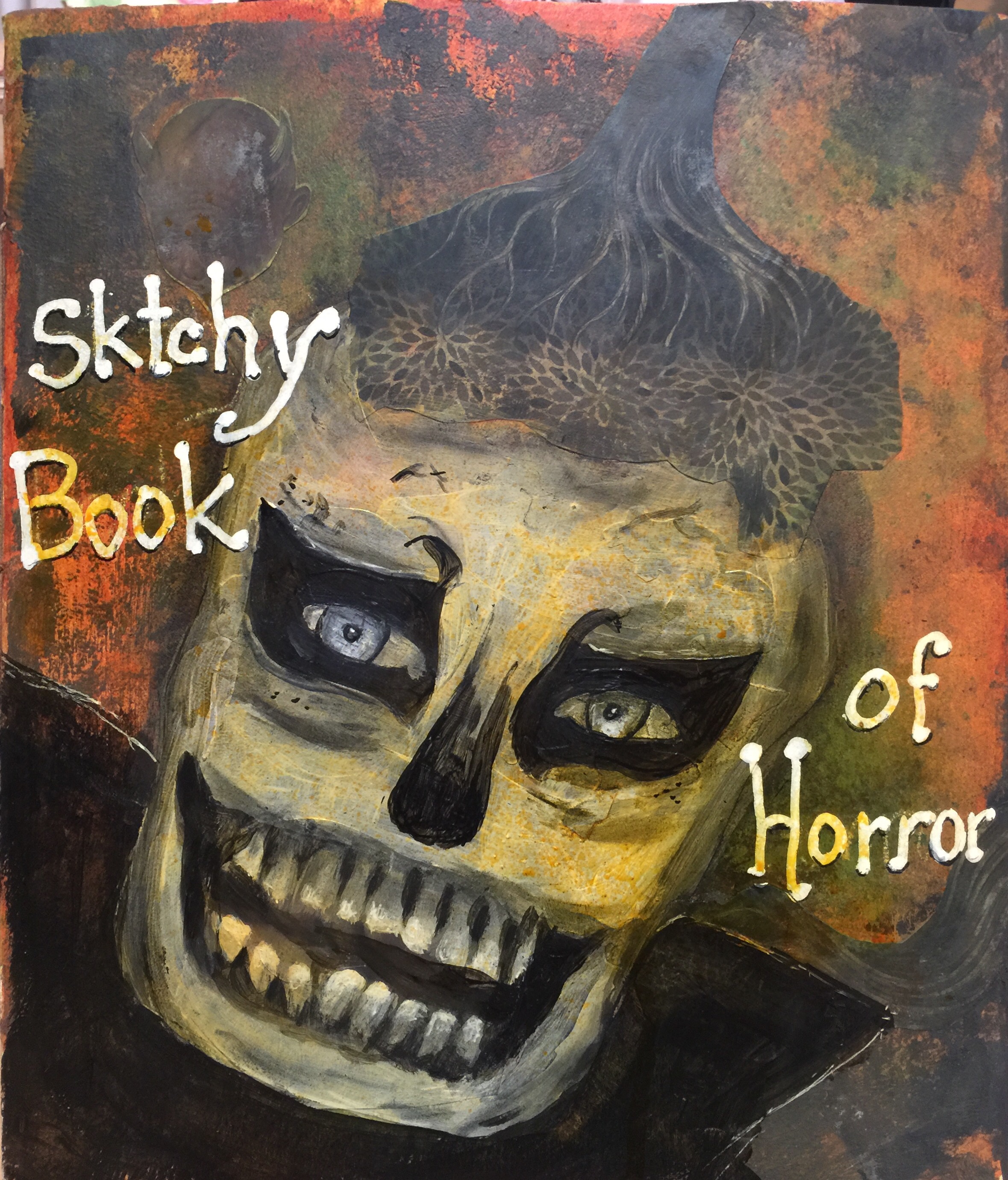 “Sktchy Book of Horror”. This is the front cover of my Homemade sketchbook. I just have the back cover to do and it will be complete. The reason I didn’t follow the reference image completely is I wanted to use the wonderful makeup as a guide to decorate the skull collage that I had originally used as the cover and incorporated everything for the final piece.