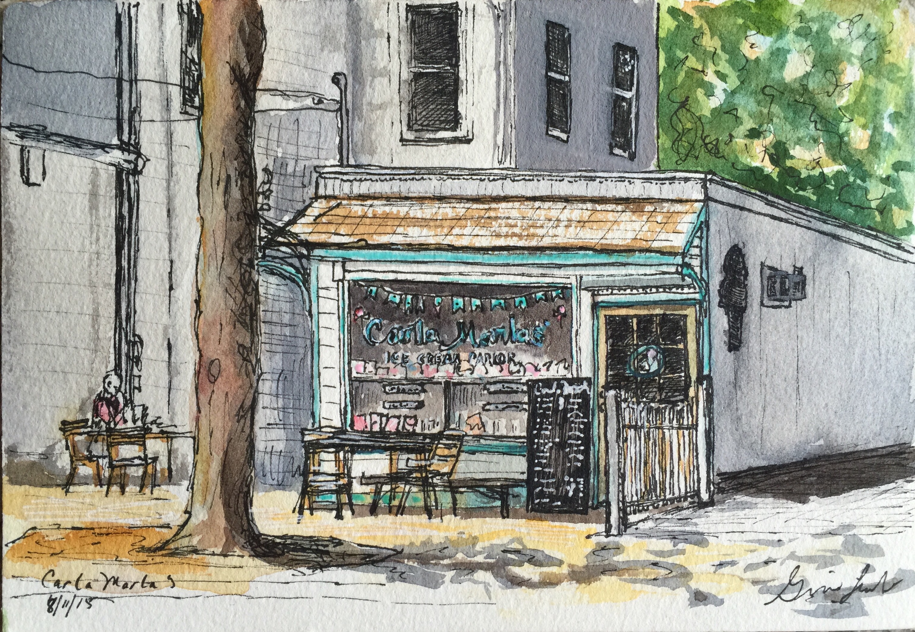 A disclaimer, these are NOT meant to be masterpieces or something to hang on a wall, these were “moments” I tried to capture quickly. I didn’t add watercolor until after I got home and I hadn’t planned on sketching so all I had on me was my homemade sketchbook that I carry in my handbag and a Lamy Safari pen that had Noodlers Violet ink in it, which I noticed was not waterproof…….