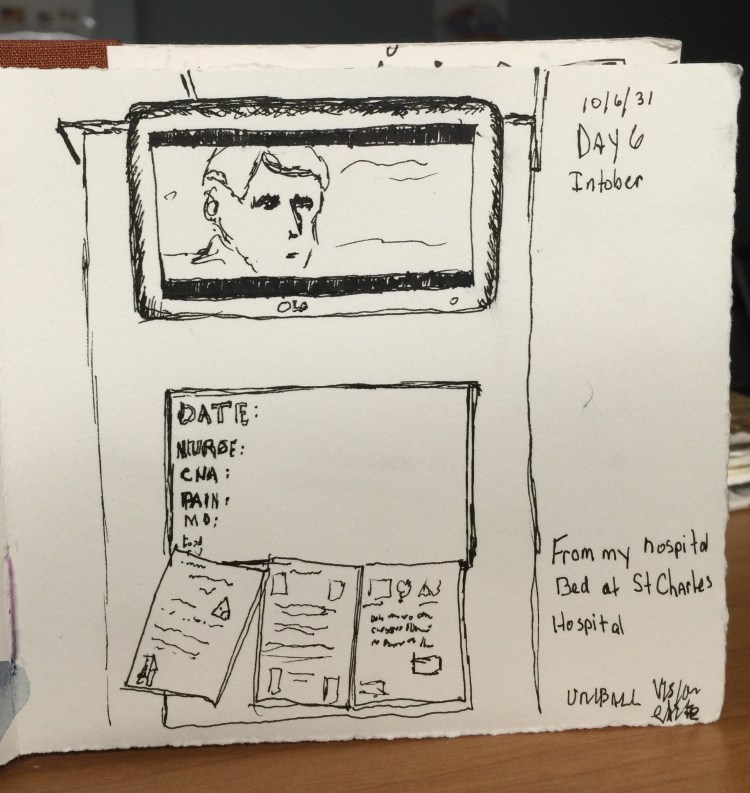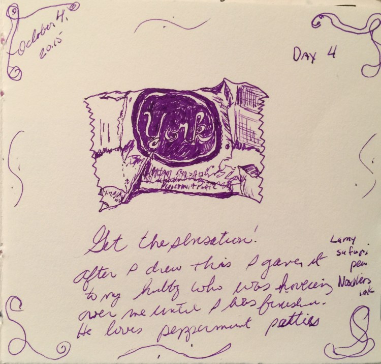 Here is my #Inktober Day 4. I sketched this at the nursing home visiting my mother-in-law while my husband hovered waiting to snatch up his favorite candy. They were coloring and I had given my mother-in-law some candy which she happily ate and we all created “art” together…..my husband eventually got the peppermint patty.
