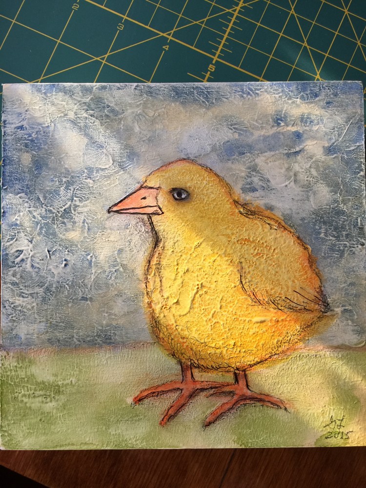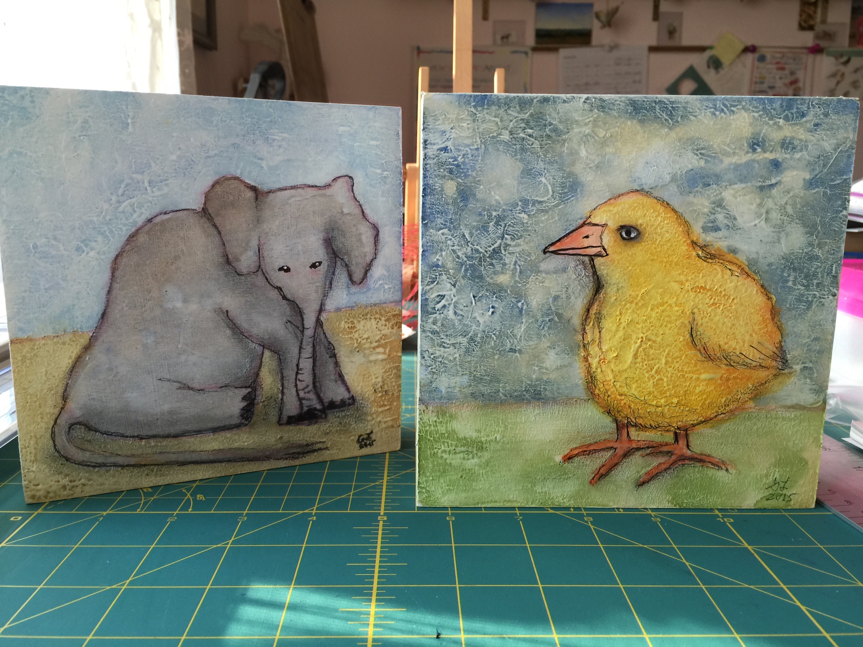 Here’s are mixed media critters that I did on wood. The chick is a character. He didn’t quite come out like I sketched him. This guy took on a whole different persona and much to my delight, his own personality….the second photo is an elephant and it’s amusing how many people think he looks sad. Both of these critters came from original sketches I did in my sketchbooks.