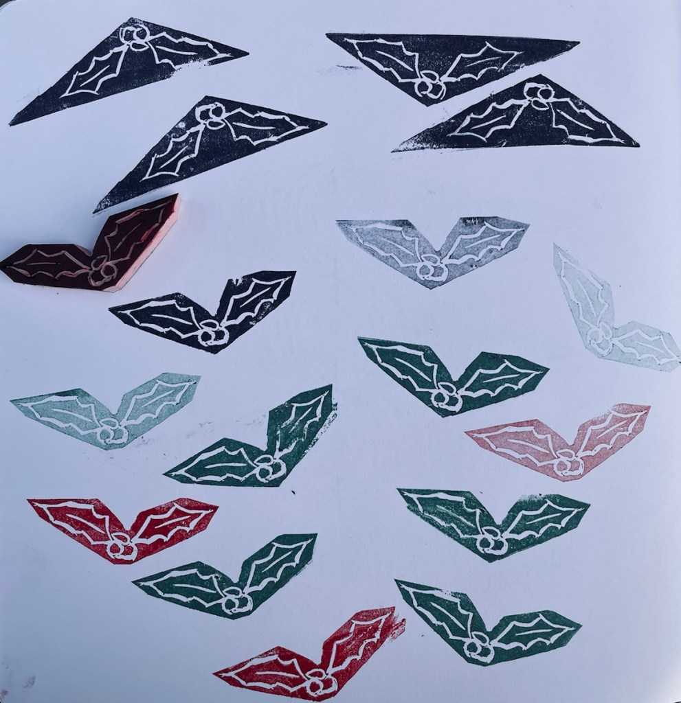 Today seemed a day of multiple challenges. I was playing with the cutter to do a Linocut wreath. It came out pretty decent, after I filled up four pages in my sketchbook of test runs. LOL. It was done free style so I didn’t draw out a sketch for transfer to the linocut material, I winged it. It was a little daring but I am happy with it.