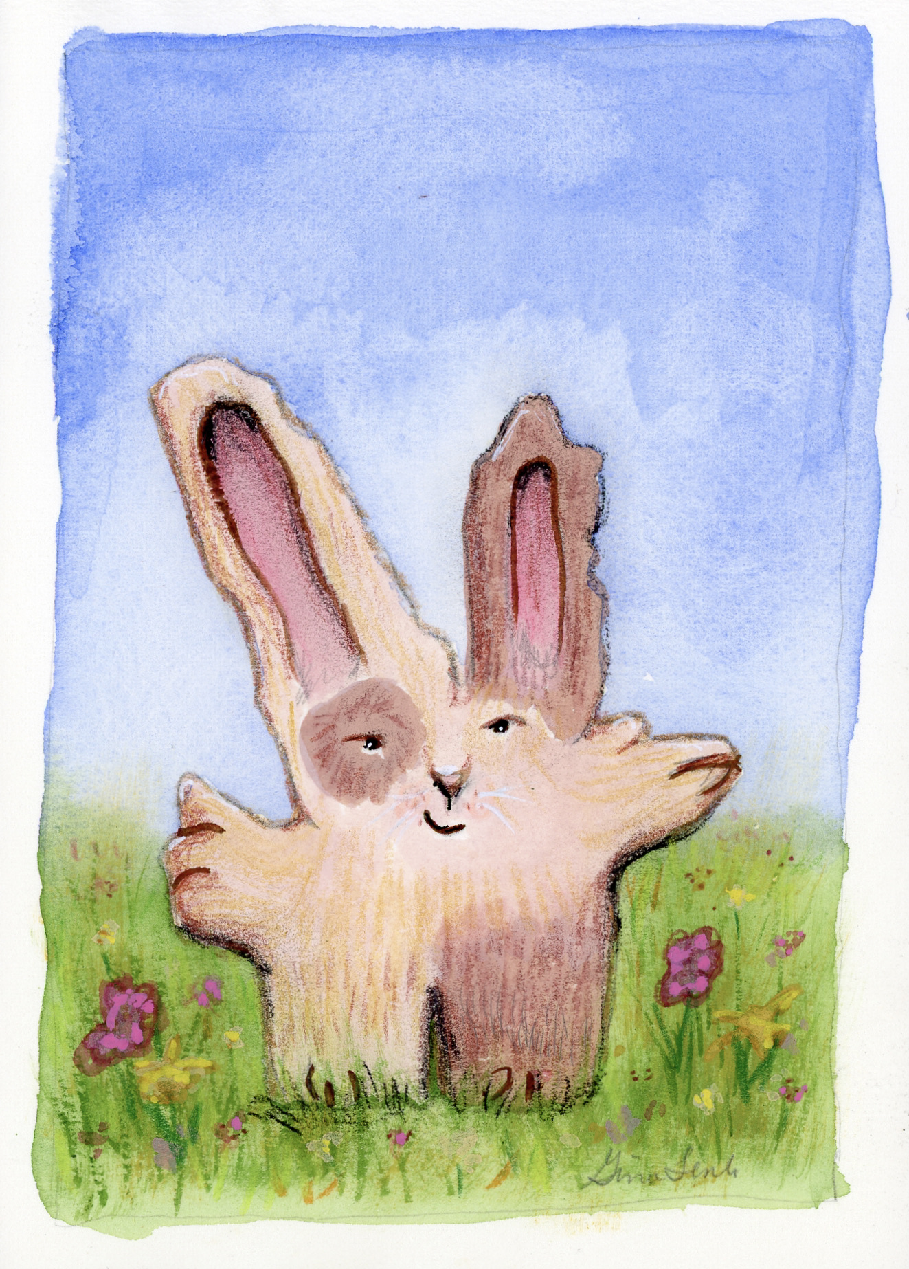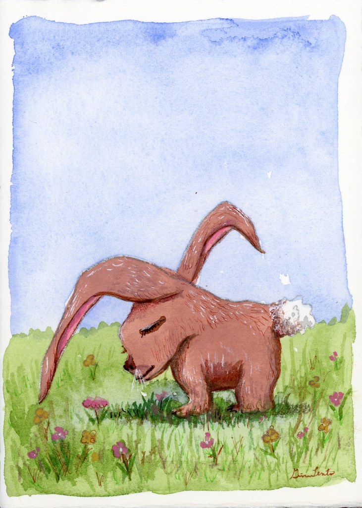 It’s April and Easter is only a few days away so I am starting off the month with a few Easter critters. I had several blob creatures that looked like bunnies and this is one of them. I am working in a sketchbook that is made from a leather cover with Arches Text Wove paper which is very soft and is very nice to work with water media.