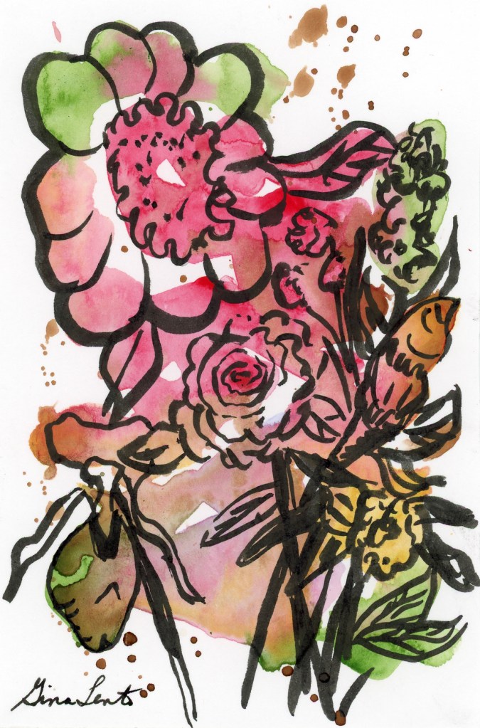 I didn’t think I would say this but I am really enjoying this technique. It’s very liberating. No rules, just drawing with the brush pen what I feel the watercolor marks are telling me to do. I may get a few more pages ready in my sketchbook so I can do more. In the mean time I still have some other stuff to get done but the nice thing is I can take a break and watch TV and do these type of flowers.