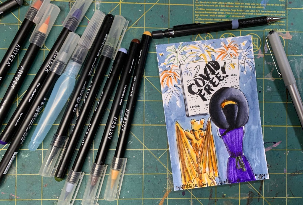 Today’s prompt for Inktober is “hope.” Witches are born with a different sort of immunity which COVID doesn’t affect, but the Little Witch and dragonet have lots of human friends. In this year of a pandemic, HOPE means that we are praying for a swift end to this world crisis. HOPE also means that this virus gets conquered by a vaccine or mutates into something benign.
