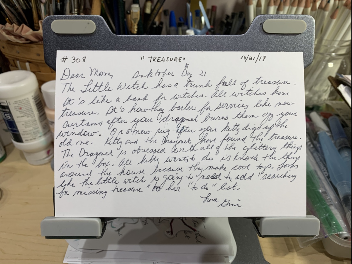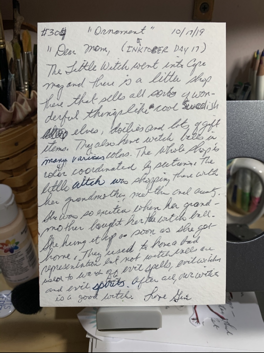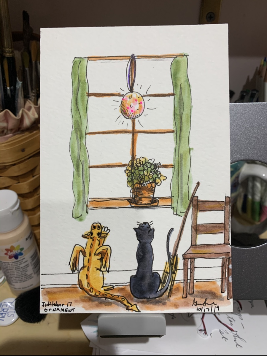 I actually don’t mind the garage being my studio when the door is open. There’s nothing across the road except two undeveloped lots. Occasionally there are critters that visit, mostly of the lizard persuasion. There’s a turtle that comes around to graze on the lawn and tropical birds. Once in a while we hear riff riff raccoons knocking over trash cans or squabbling in one of the lots across the road.