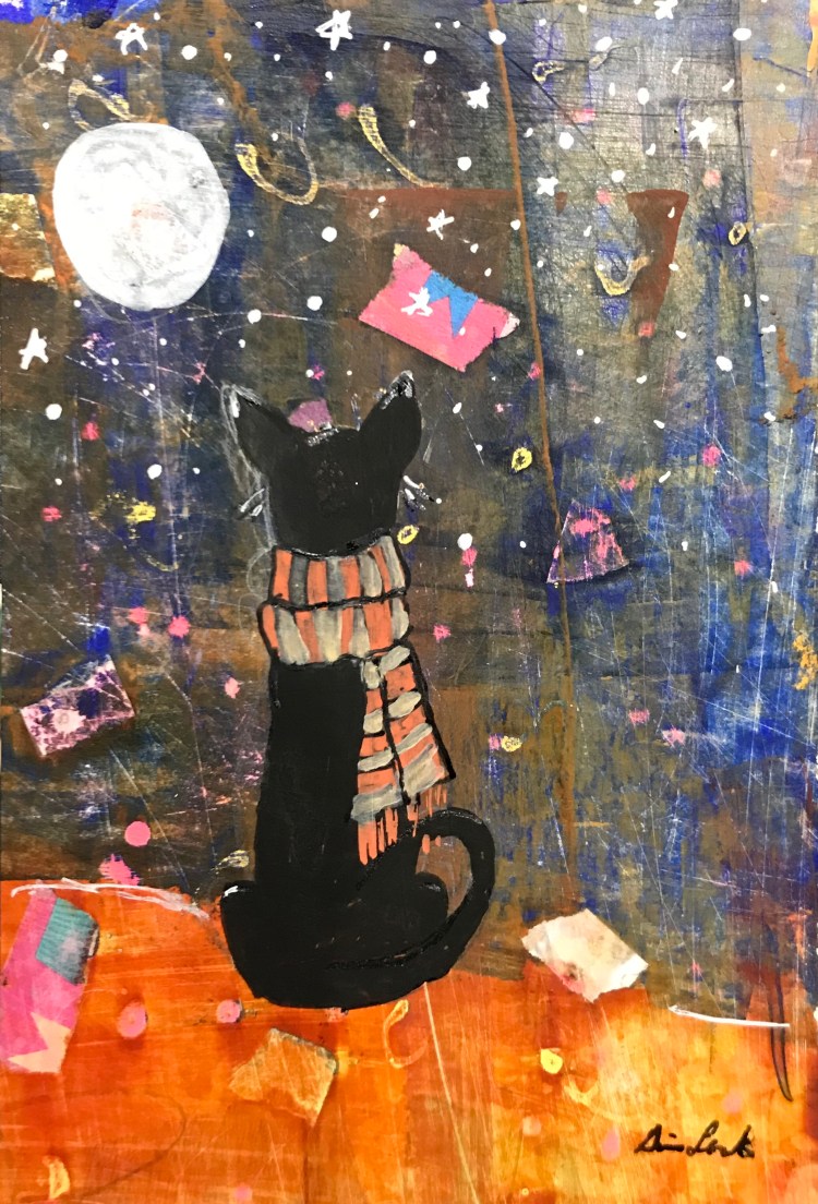 It’s getting a lot cooler. It’s brisk and Novembers can be windy. The little witch is still stuck in pilgrim-ville. Kitty doesn’t care. She has lots of things to keep her busy, like apples.