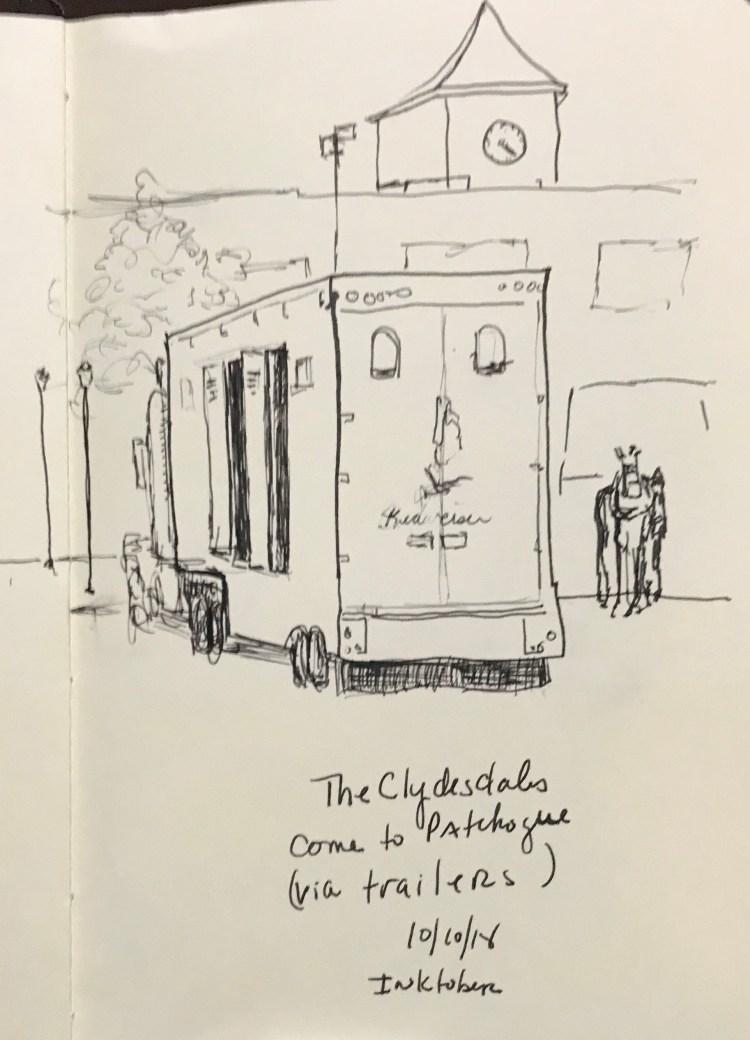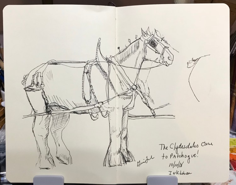 This was an exciting day because the Budweiser Clydesdales came to our town! They we here to celebrate 85 years of the repeal of Prohibition. Plus, Blue Point Brewery is getting ready to open at their new location on Main Street. I was lucky (and smart) to get a great spot to do some sketching! I managed some time to do one of the trucks and the big guy right in front of me. It was very exciting to be able to sketch them. The new Blue Point Brewery is behind the truck.