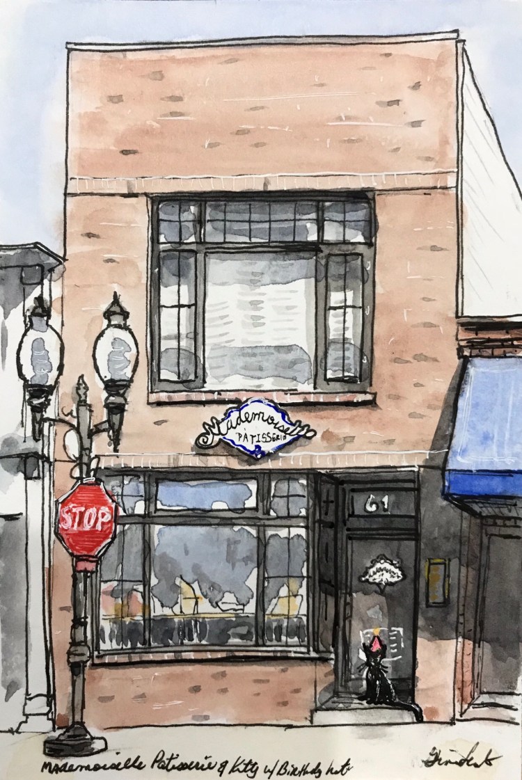 Here is the third kitty that I did to celebrate my mom’s birthday. There is a new bakery in the Village and their pastries are amazing. What better place for a birthday kitty to hang out!