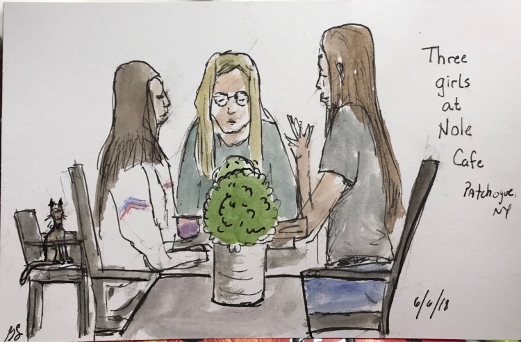 There was a grand opening of a new cafe today. All organic juice bar, açaí bowls, smoothies, etc. It was packed tonight. It’s like the whole gym down the street emptied out and went to the new juice bar. I sketched these three girls. I added the kitty😎.