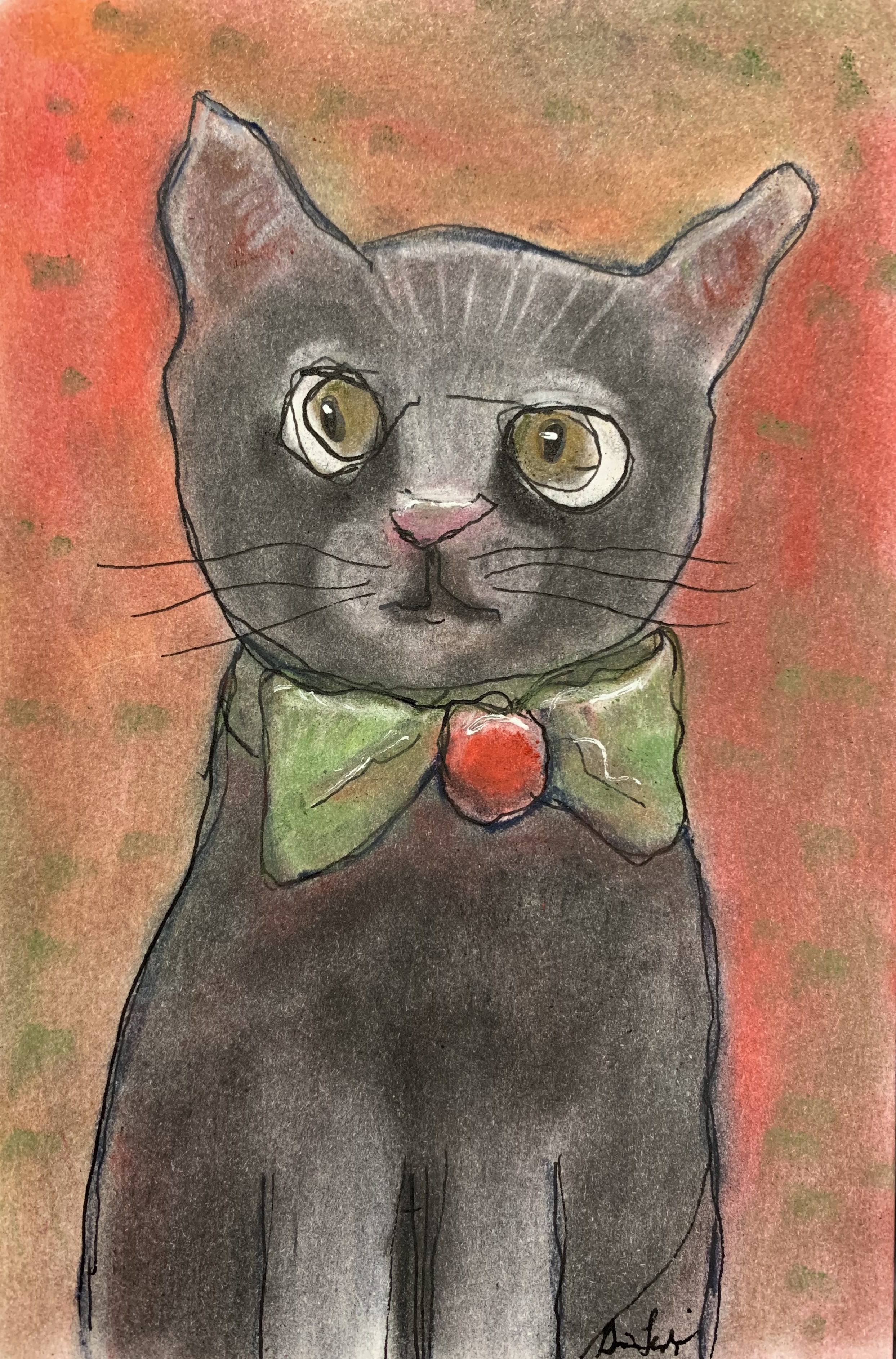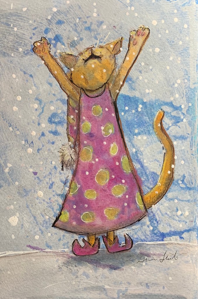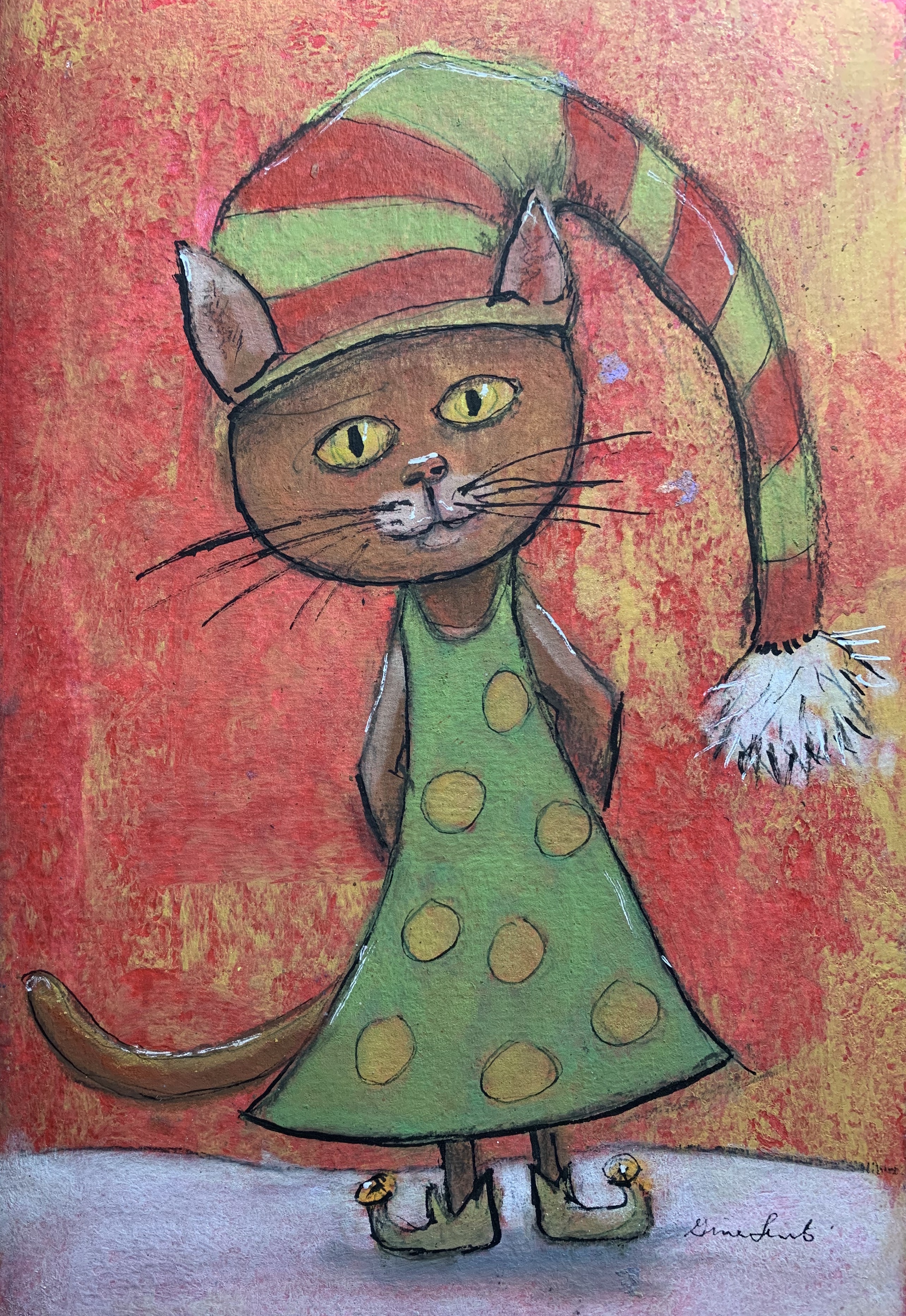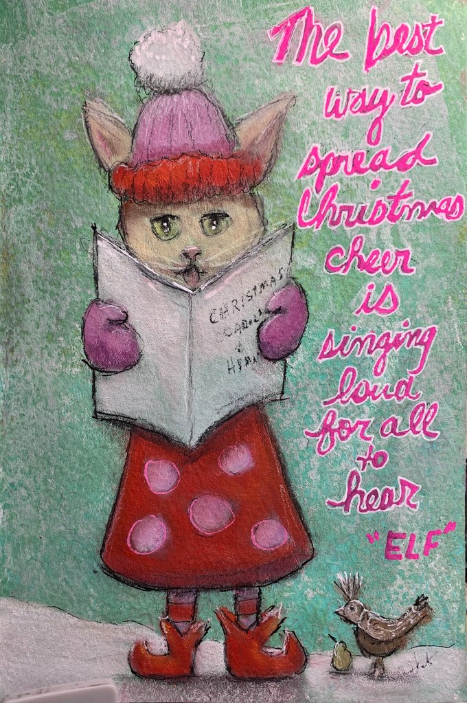 This project was part of my “postcard a day” project. I made a sketchbook and used acrylic paint as my background, drew a bunch of kitties in my sketchbook and these sketches became the Kringle Kitties.